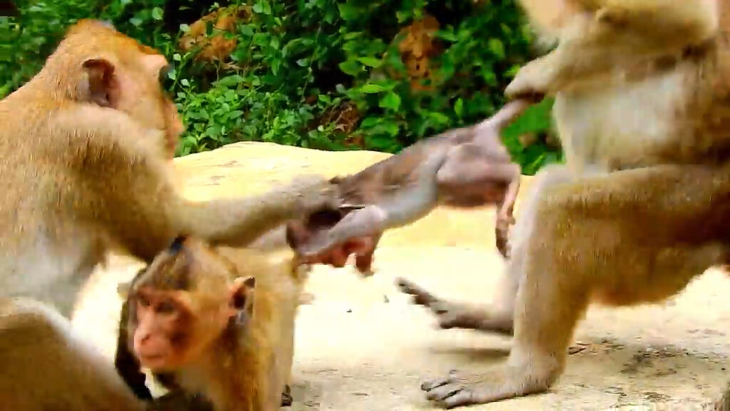 A heartbreaking scene unfolded today when a tiny baby monkey was caught between the anger of her mother and the cruelty of a rough kidnapper. The little one, barely strong enough to hold onto her mother’s fur, cried helplessly as chaos surrounded her. The mother, already tense and protective, suddenly lost control when another adult monkey approached to drag the baby away. In the terrifying moment, the poor baby’s fragile body twisted painfully, almost breaking under the harsh pulling.