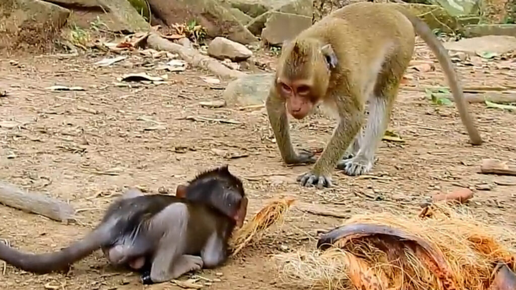 Nearby mothers looked on anxiously, some stepping forward but too afraid to challenge Dee Dee. The baby’s soft fur was covered in dust, and she whimpered weakly, trying to crawl away from the older monkey’s reach. Moments later, Dee Dee finally released her grip and walked off angrily, leaving the poor baby trembling beside the tree.