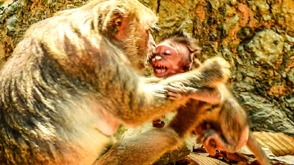 Nearby monkeys stopped and stared, frozen in shock. Some mothers covered their babies, afraid that Jade’s anger might spread like wildfire. The pain in Jayden’s little face broke every heart watching. He tried to crawl away, shaking and scared, but Jade pulled him back again and again, refusing to calm down.