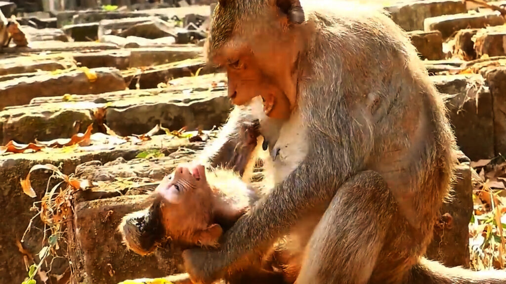 Ada, still small and fragile, cannot understand why her mother refuses to feed her. Each time she reaches for milk, Angel pushes her away, sometimes biting or hitting to keep her off. The little one trembles, her cries turning into fits of distress that almost look like seizures — her tiny body shaking, her voice weakening as she pleads for comfort that no longer comes. The other monkeys glance over but do nothing; this is part of nature’s harsh rule, yet it feels unbearably cruel to watch.