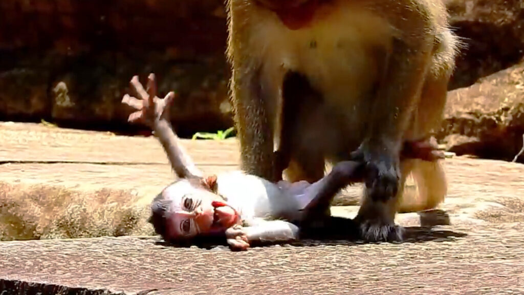 What a heartbreaking moment in the troop today! Poor baby Daniela screamed in pain as her mother DeeDee acted so roughly again. Daniela’s tiny body looked weak and helpless, yet DeeDee still dragged her along the ground, pulling her by the arm and tail without care. The baby cried so loud that even the other monkeys stopped to stare — their eyes filled with confusion and pity. Daniela’s desperate cries echoed through the trees, her small face covered with dirt and tears, begging her mother to stop.