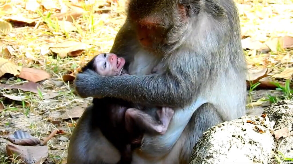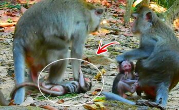 In a heartbreaking moment deep inside the Angkor forest, the peaceful morning turned emotional when a tiny baby monkey was seen crying mercifully under his mother’s strict discipline. The little one, barely old enough to walk steadily, had been playfully exploring around when his mom suddenly lost patience. What seemed like a small act of mischief quickly led to a harsh reaction — a moment too painful to watch.