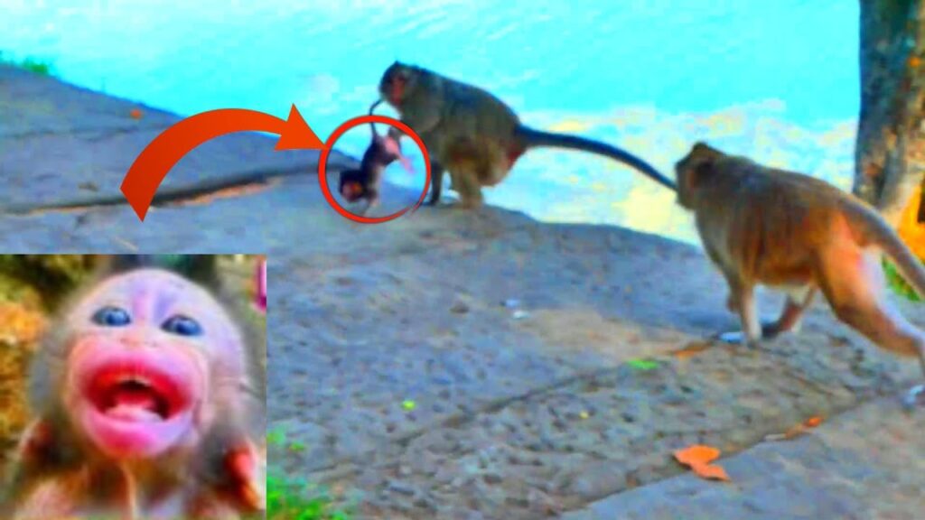 What a heartbreaking moment in the monkey troop today! A tiny newborn, still weak and trembling, was cruelly taken away from his real mother. The scene was full of chaos and pain — the desperate mother screaming, reaching out with shaking arms, her eyes filled with tears as she tried to protect her little one. But the kidnapper, a jealous female monkey, ran fast and far, clutching the helpless baby tightly to her chest as the poor mother cried helplessly.
