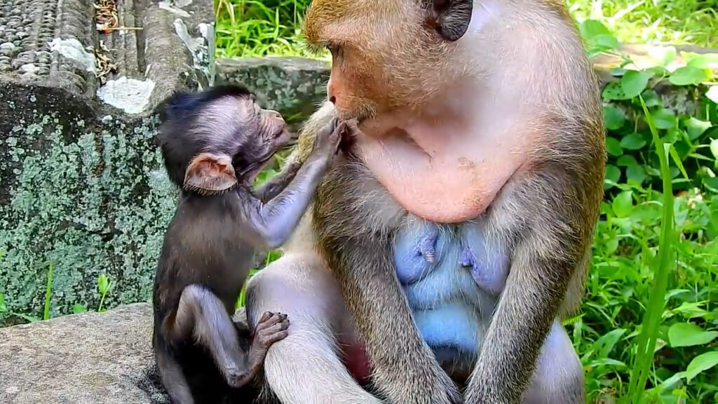 The mother’s discipline seemed too harsh for such a fragile creature. Her bites and slaps were not playful; they were filled with frustration, perhaps from stress, hunger, or the burden of protecting her troop. The baby trembled, crying for comfort and milk, yet the mother pushed him away, making the little one even more desperate. His innocent face showed confusion — why was the one he trusted most acting so cruelly?