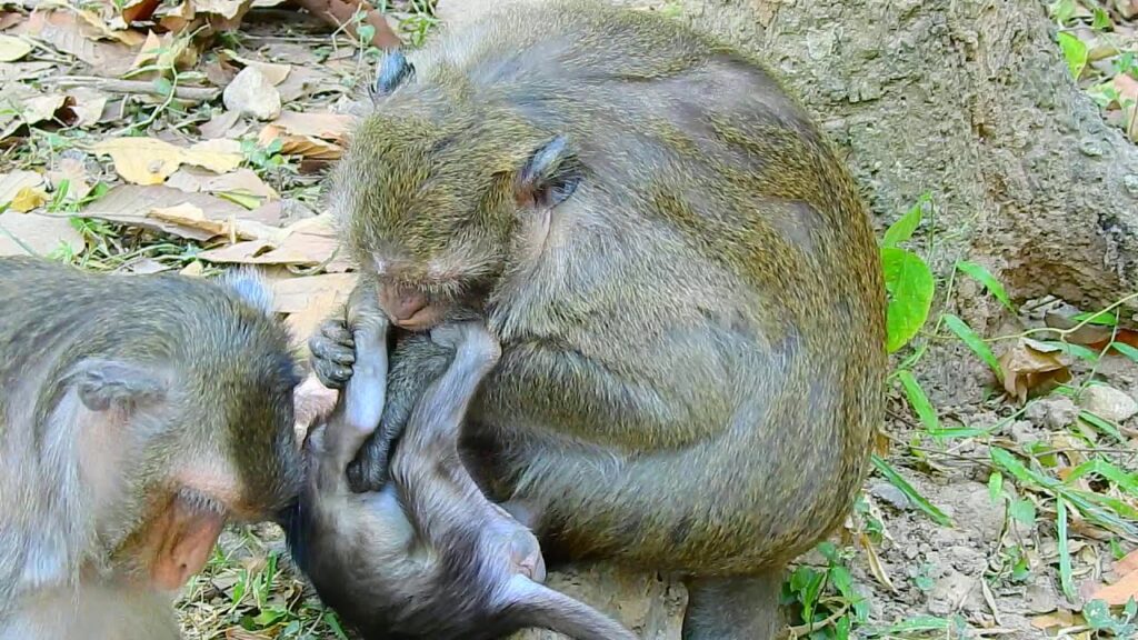 The baby’s small hands reached out, trying again to cling to her fur, hoping for the familiar comfort of milk and safety. But his cries only seemed to anger her more. She yanked her body away, leaving him sitting alone, helpless and terrified. Nearby, other monkeys watched the sad moment unfold, unsure whether to interfere. The air filled with the baby’s pitiful sobs, a sound that pierced through every heart that witnessed it.